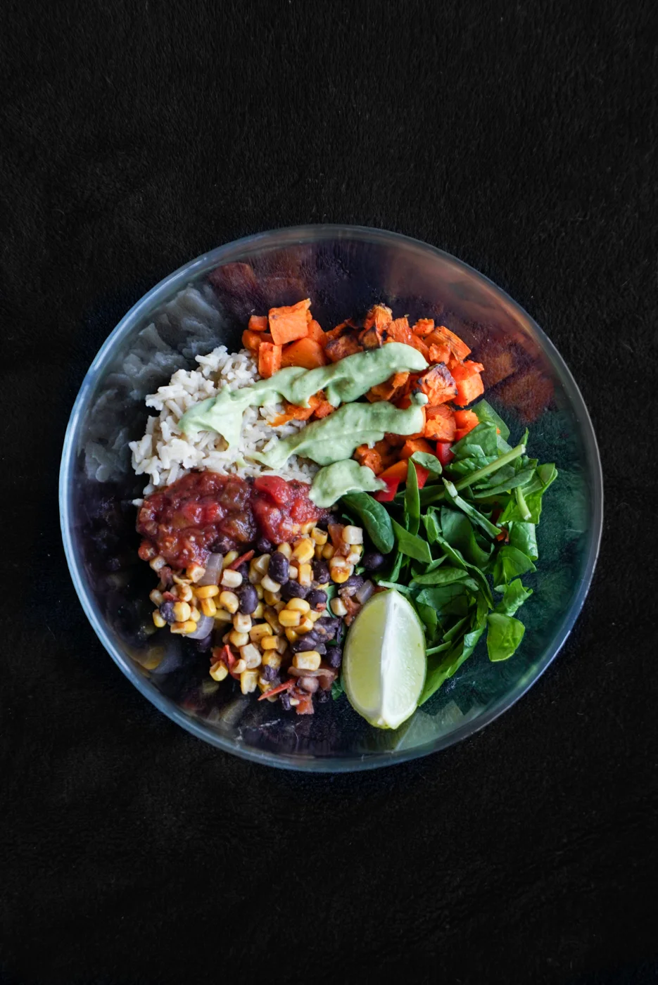 Plant Based Burrito Bowl topped with Lime, Avocado & Cilantro sauce && Mango Salsa // Gluten, Dairy & Meat Free